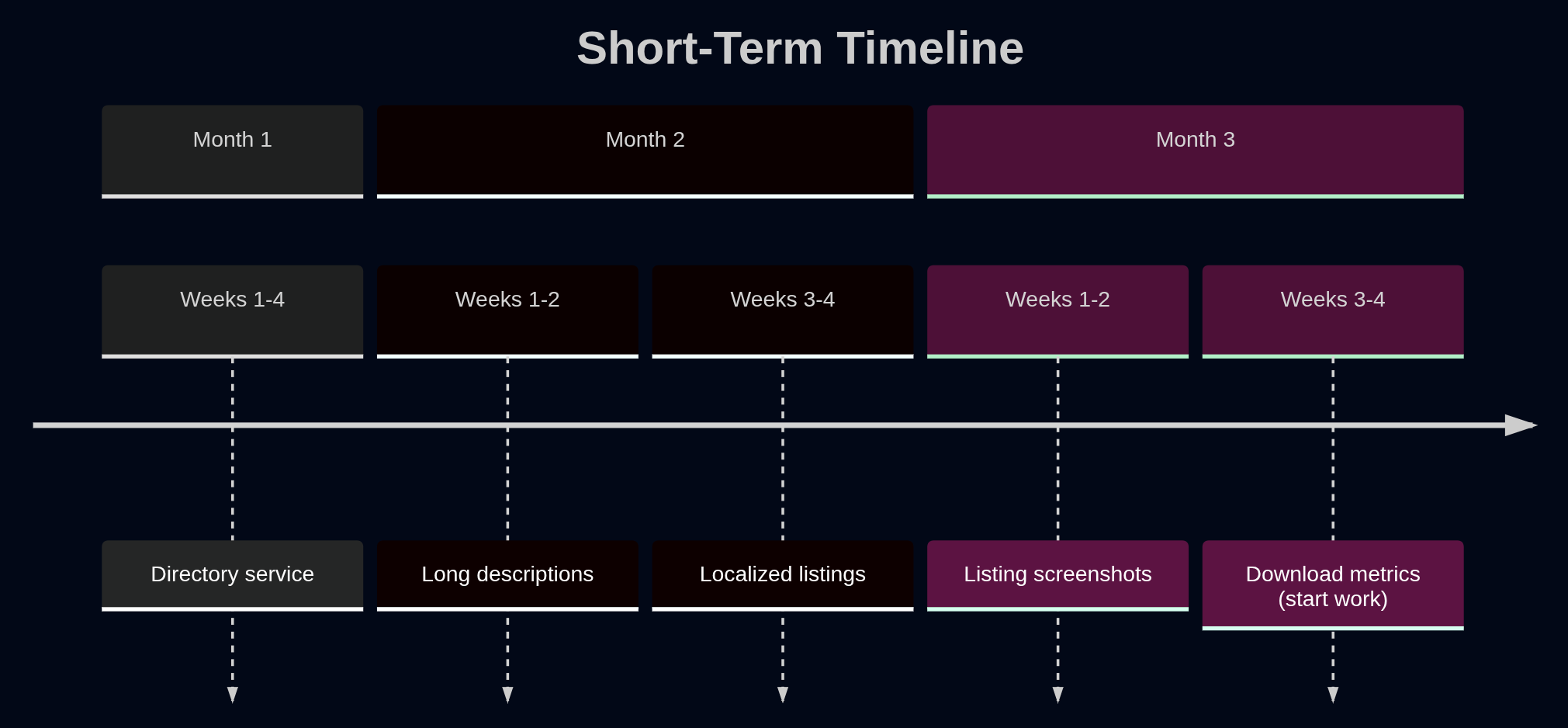The above image summarizes the features we want to implement (or start implementing) in the next 3 months of Accrescent’s development. Here’s what they mean: